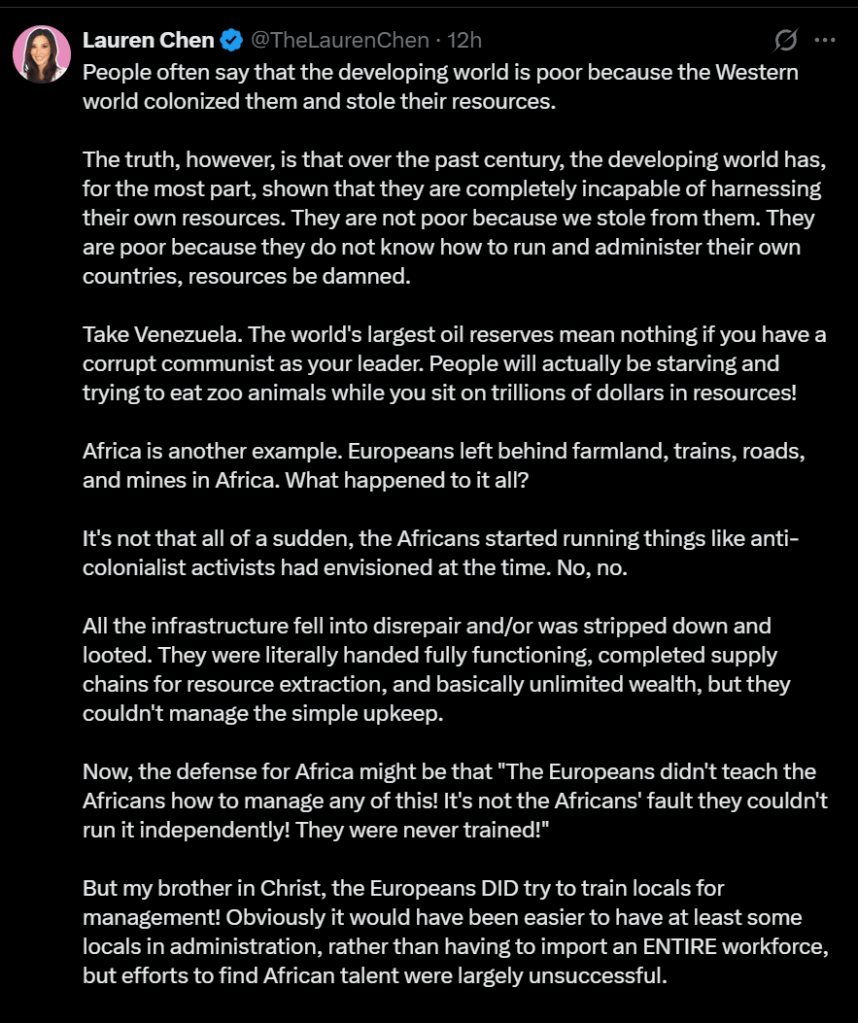 This is a post by Lauren Chen I randomly saw on my Twitter feed; she is a “Wasian” with a white mom and this rich Chinese banker dad who bought her mom or something.