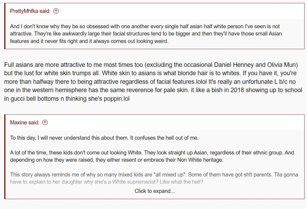 Here’s a black woman from LipstickAlley basically saying the obvious about them. Just being half white isn’t automatically “attractive.” It’s just that Asians are just THAT self hating. Black women are also persona non grata number one in our society, so it’s no wonder she’s calling a spade a spade and stating the obvious. If anything the real reason behind fetishizing such ugly as hell Wasians is rooted in the fact that hot full Asian men and hot black women would call them out.