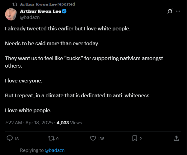 ๐€๐ซ๐ญ๐ก๐ฎ๐ซ ๐Š๐ฐ๐จ๐ง ๐‹๐ž๐ž on X: “I already tweeted this earlier but I love white people. Needs to be said more than ever today. They want us to feel like โ€œcucksโ€ for supporting nativism amongst others. I love everyone. But I repeat, in a climate that is dedicated to anti-whitenessโ€ฆ I love white people.” / X