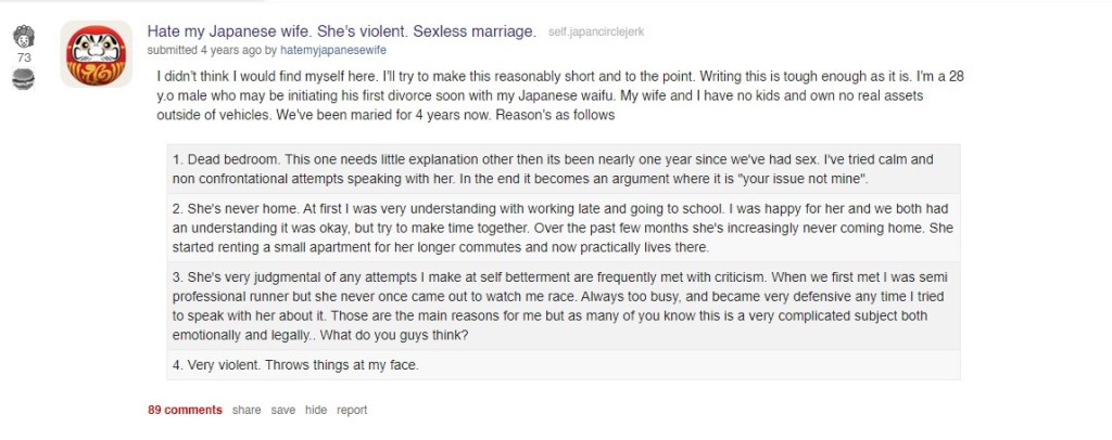 I suspect a lot if not most Asian and even half-Asian women are genuinely asexual, which makes them less “slutty,” which means in the far-right white man’s mind, they cannot cheat and “divorce rape” white men. After all, you can’t bang another man if you can’t bang at all. However, the asexuality generally causes problems, because no marriage can be fulfilled while being asexual…. but I’ll touch on that later.