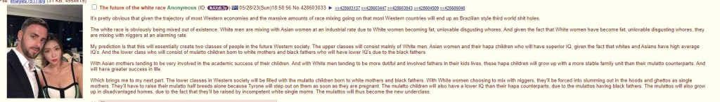 Add to this the fact that Elliot Rodger’s sister was having loud sex with guys in his house (which is basically sexual assault, but again, we’re not allowed to heckin’ talk about this), he basically was messed up from the start, since obviously there’s no changing how hypersexualized our society is while we’re basically never gonna address the trend of unsexable men going for foreign women. It’s a terrible mix; western society has become a sexual meat grinder, and the incels left over basically all go for East Asian women to feel like they’re not left out. Since our new society is so sex-focused and completely drained of any empathy as people grow more and more insecure and desperate, East Asian men will remain the permanent Persona Non Grata – the universal punching bag for the insecurity of every undersexed bastard around. I find it funny that white men visualize this future with their well-educated, super-tall, super-athletic, rich, masculine, beautiful half-Asian sons being able to compete with “Chads”, when they don’t realize that their sons – by their own definition within their own ideal society – fail to meet the mark, due to being half-Asian.