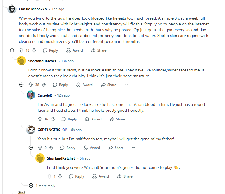 As a result, some people say I look predominantly Asian, while others say I look whiter (to an extent that I don’t really identify as mixed). Ultimately, when people find out that you’re half Asian, they will eviscerate you for it to the point that you give up talking about being half white at all, in my case.