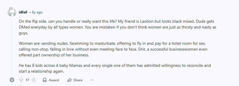 I’m not against intermarriage; I’ve been with almost every race of woman. I’m not crazy. I just want to write about this, because I think it’s worth writing about. I think it’s incredibly unfair and cruel. Heck, maybe the fact that I’m attractive to women gives me the balls to write about this in the first place, cause, what will I lose? People can call me incel and a “bitter full Asian man” all they want, but stepping outside proves otherwise.
